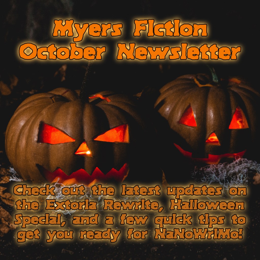 While my Extoria Rewrite has been acting up like a spoiled child, I finally have the restructured plot laid out and ready to go. Right now, I am working on putting the pieces of the stories in the correct places. This will still take a little longer than copying and pasting as I adjust the timelines a little. My Beta readers played a large part in this rewrite and I once again thank them for their time. If you’ve been staying up to date on The Day the Earth Went Dark, you know I closed out the storyline in September. Now I hope you’re ready for 31 days of horror filled fun in my blog story The Exhibit, more on that later. In November I will start a weekly Podcast titled Authors of Tomorrow. I want to use it to help motivate Authors and maybe help those taking part in NaNoWriMo with the process.