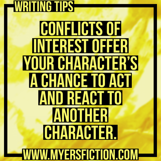 Conflict of interest is not limited to conversation and beliefs, but can also include conflicting goals, motivations, or desires among characters can drive the plot forward. By setting your protagonist with someone with a conflict of interest, you’re more likely to drive the story along with more interest from your readers. Because as you make the points for the conflicting interests, the readers will formulate their opinions on who they agree with more. You can also use this type of conflict to jump start a story out of a lull.